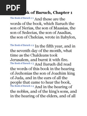 The Book of Baruch occasionally referred to as 1 Baruch is called a deuterocanonical or apocryphal book of the Bible. SECOND BARUCH CHAPTER 15 And it came to pass in the twenty-fifth year of Jeconiah the king of Judah that the word of the Lord came to Baruch son of Neriah 2 and said to him. The Book of Baruch is a deuterocanonical book of the Bible used in most Christian traditions such as Catholic and Orthodox churches.